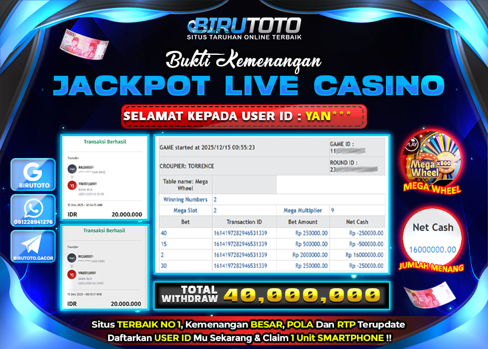 Selamat Kepada Member BIRUTOTO YA**** Telah Jackpot Di LIVE CASINO MEGA WHEEL